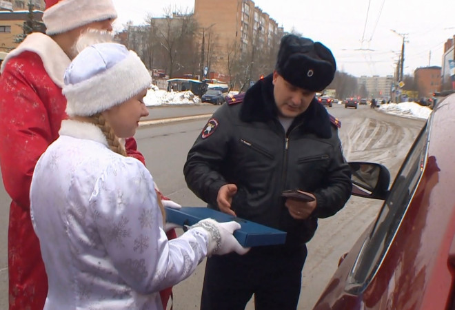 Так дорожные полицейские в роли Деда Мороза и Снегурочки и председатель Общественного совета при городском УМВД поздравили водителей и пешеходов с наступающими праздниками – Новым Годом и Рождеством. На улице Нормандии-Неман они останавливали транспортные средства и вручали автомобилистам подарки: фликеры, сладости и фрукты. Кроме того, Полицейский Дед Мороз обратился к участникам дорожного движения с просьбой внимательно следить за изменениями погоды и соблюдать правила дорожного движения. В ходе акции профилактическая работа проводилась также и с пешеходами.
