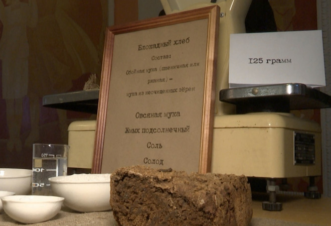 На стенде представлены две буханки хлеба. Одна сделана по рецепту нашего времени, вторая дает возможность попробовать хлеб, который пекли в блокадном Ленинграде. Состав блокадного хлеба по объективным причинам со временем менялся. Так, специалисты сельскохозяйственной академии воссоздали рецепт, по которому его готовили в начале блокады: осенью 1941 года. Чтобы получить килограмм хлеба, нужно было 570 граммов муки из неочищенных зерен, 200 граммов овсяной муки, к ним добавляли жмых подсолнечный, соль, солод и воду.
